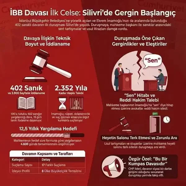 Cumhuriyet'in aktardığı habere göre, İstanbul Büyükşehir Belediyesi'ne (İBB) yönelik mali soruşturma kapsamında hazırlanan 3 bin 900 sayfalık iddianameyle açılan ve aralarında seçilmiş İBB Başkanı ve CHP'nin cumhurbaşkanı adayı Ekrem İmamoğlu'nun da bulunduğu 107'si tutuklu 402 sanıklı davanın üçüncü celsesi bugün Silivri'deki Marmara Kapalı Cezaevi Duruşma Salonu'nda görülüyor.