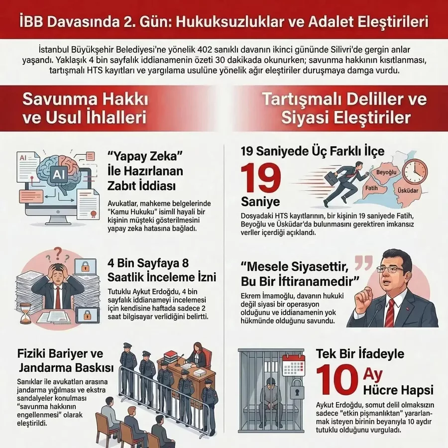 Yargılananlardan CHP'li Aykut Erdoğdu'nun savunmasını yaptığı ikinci güne ise "yapay zeka" tartışması damga vurdu. Avukatlar iddianamenin kabulünün ardından düzenlenen tensip zaptında yapay zekâ kullanıldığını iddia etti. Tensip zaptında müşteki sırasına "Kamu Hukuku" yazılıp "Kamu Hukuku"nun kişi olarak ifade edildiği ve karşısında 1 Ocak 1980 doğumlu, "Kamu oğlu" olduğu eklendiği görüldü. Zapta tepki gösteren avukat Ali Rıza Dizdar, "Bu tensip zaptı ile 106 kişinin tutukluluğunun devamına karar verdiniz. Bu kararı da mı yapay zekâ verdi?" dedi.