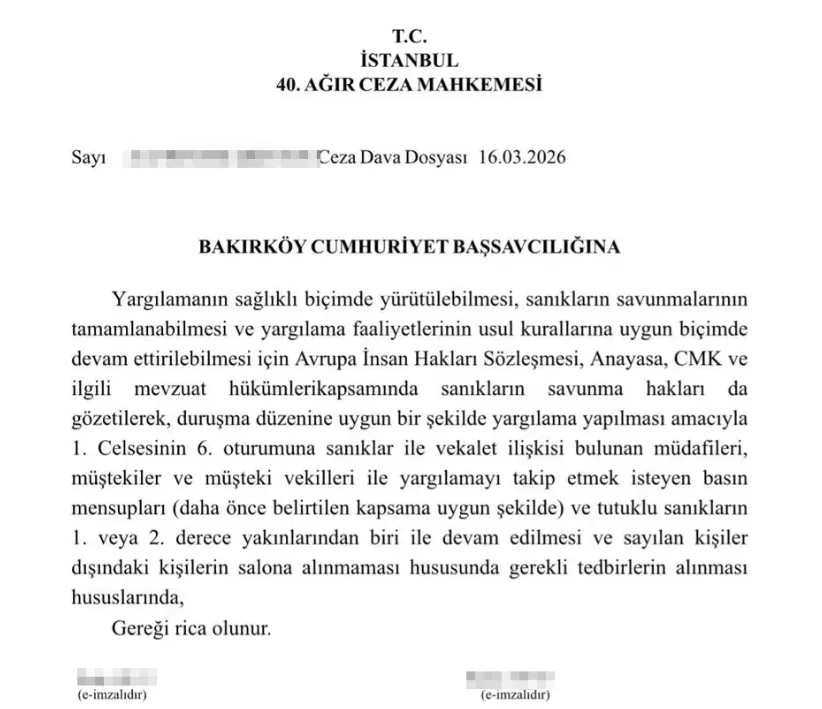 6'ncı oturumu öncesinde Bakırköy Cumhuriyet Başsavcılığı'na bir yazı gönderdi. Mahkeme, yargılamanın "sağlıklı biçimde yürütülebilmesi", sanık savunmalarının tamamlanabilmesi ve duruşma faaliyetlerinin usul kurallarına uygun sürdürülebilmesi amacıyla salona alınacak kişilere ilişkin tedbir talep etti.