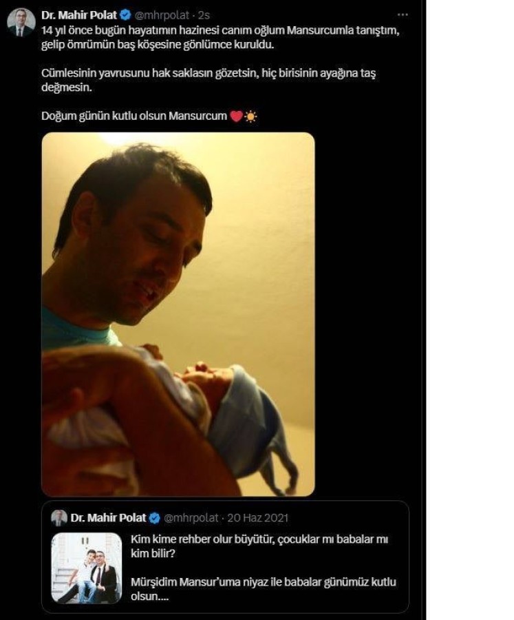 İstanbul Büyükşehir Belediyesi'ne yönelik Kent Uzlaşısı operasyonu kapsamında 23 Mart'ta tutuklanan ve 9 Nisan'da ev hapsi cezasıyla tahliye eden İBB Genel Sekreter Yardımcısı Mahir Polat, sosyal medya hesabı üzerinden yaptığı yeni bir paylaşımla oğlunun doğum gününü kutladı.