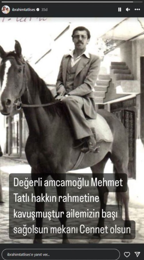 Acı haberi sosyal medya hesabından duyuran İbrahim Tatlıses, "Değerli amcaoğlu Mehmet Tatlı hakkın rahmetine kavuşmuştur. Ailemizin başı sağ olsun, mekânı cennet olsun" sözleriyle duyurdu.