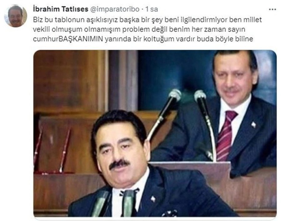 5. kez başvurduğu AK Parti'nin milletvekili aday listesinde yer almayan İbrahim Tatlıses, gelen yorumların ardından Cumhurbaşkanı Recep Tayyip Erdoğan'la bir fotoğrafını paylaşarak "Her zaman sayın cumhurbaşkanımın yanında bir koltuğum vardır. Bu da böyle biline" ifadelerini kullandı.