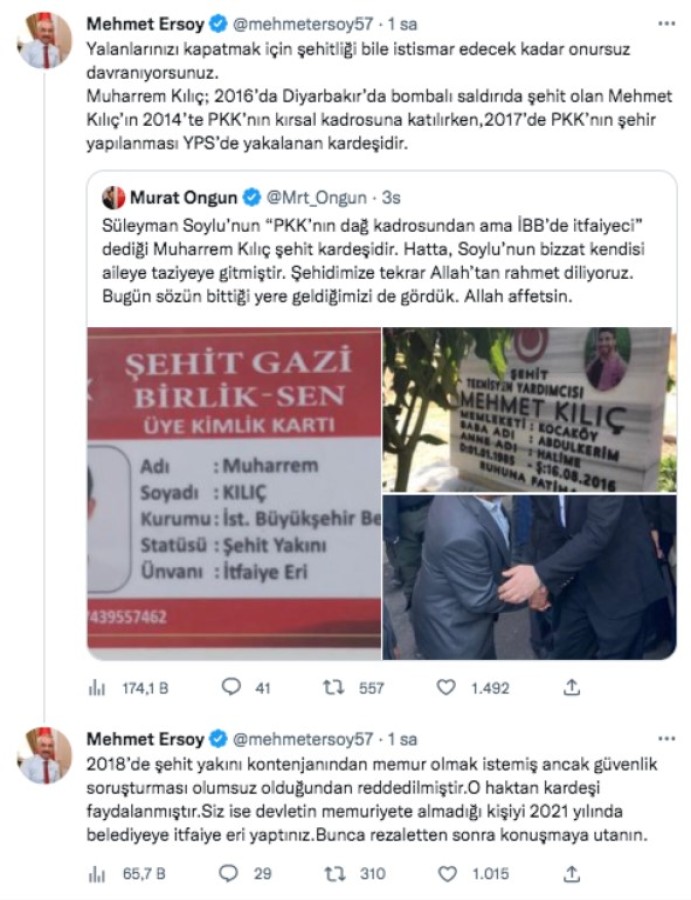 Murat Ongun'un "Süleyman Soylu'nun 'PKK'nın dağ kadrosundan ama İBB'de itfaiyeci' dediği Muharrem Kılıç şehit kardeşidir. Hatta, Soylu'nun bizzat kendisi aileye taziyeye gitmiştir. Şehidimize tekrar Allah'tan rahmet diliyoruz. Bugün sözün bittiği yere geldiğimizi de gördük. Allah affetsin" açıklamasını alıntılayan İçişleri Bakan Yardımcısı Mehmet Ersoy, şu ifadeleri kullandı: