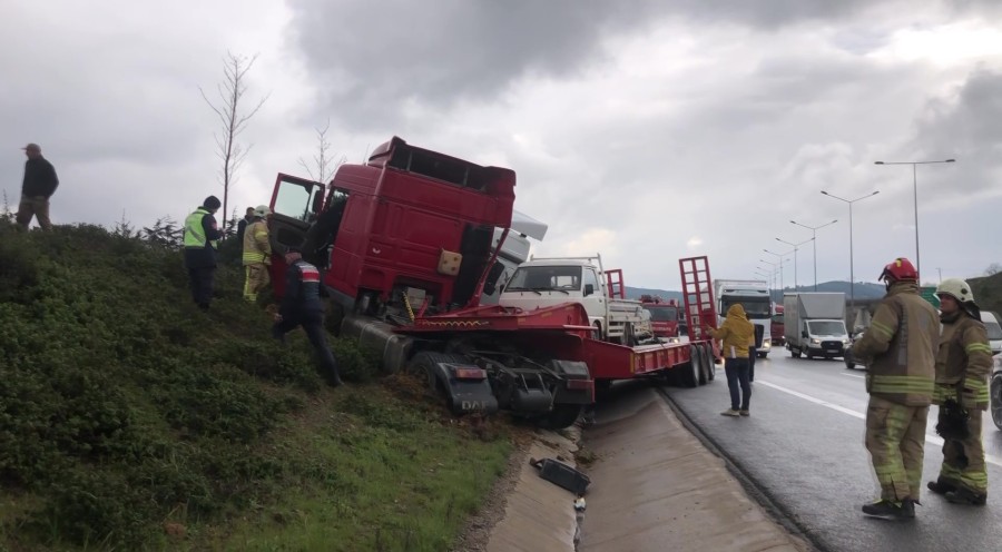 İstanbul Pendik'te Kuzey Marmara Otoyolu'nda seyir halinde olan bir tır, aynı istikamette ilerleyen başka bir tır ile çarpıştı. İki tırın sürücüsü de kazayı yara almadan atlatırken tırlardan birinde bulunan bir yolcu yaralandı. İki tır çarpışmanın etkisiyle yoldan çıkarak yol kenarındaki otluk alana fırladı.