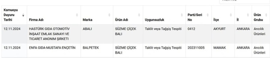 Söz konusu listede Ankara merkezli iki ünlü bal firması yer aldı. Zincir marketler ve e-ticaret sitelerinde satılan "Abalı" ve "Balpetek" markalı ballarda taklit ve tağşiş yapıldığı belirlendi.