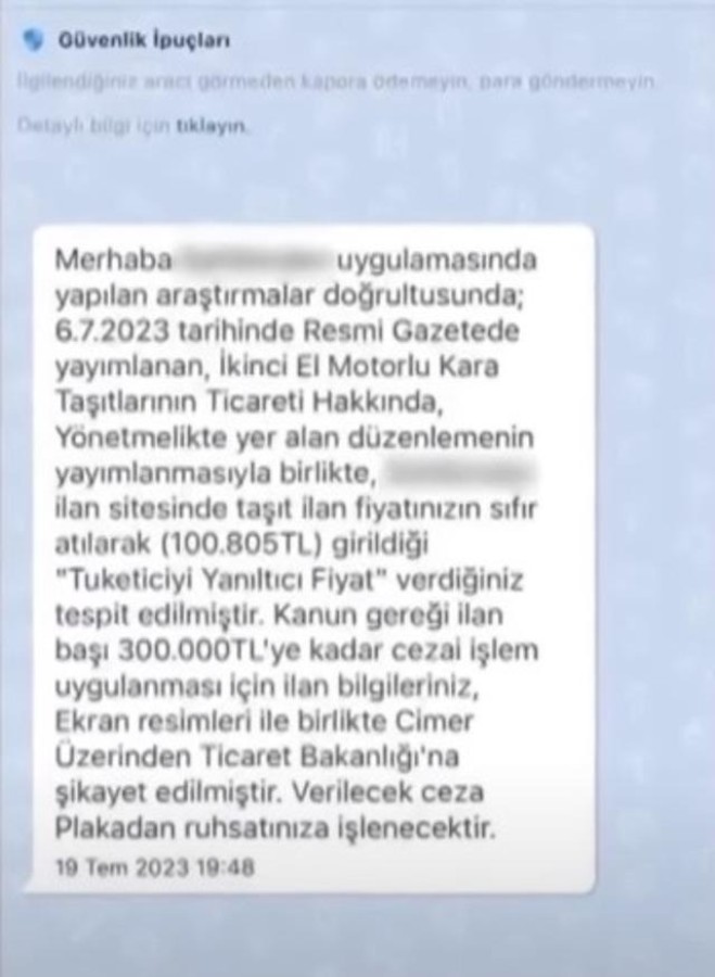 "Merhaba uygulamada yapılan araştırmalar doğrultusunda; 6.7.2023 tarihinde Resmi Gazete'de yayımlanan ikinci el motorlu kara taşıtlarının ticareti hakkında, yönetmelikte yer alan düzenlemenin yayınlanmasıyla birlikte ilan sitesinde taşıt ilan fiyatının sıfır atılarak (100.805 TL) girildiği 'tüketiciyi yanıltıcı fiyat' verdiğiniz tespit edilmiştir. Kanun gereği ilan başı 300 bin TL'ye kadar cezai işlem uygulanması için ilan bilgileriniz ekran resimleri ile birlikte CİMER üzerinden Ticaret Bakanlığı'na şikayet edilmiştir. Verilecek ceza plakadan ruhsatınıza işlenecektir."