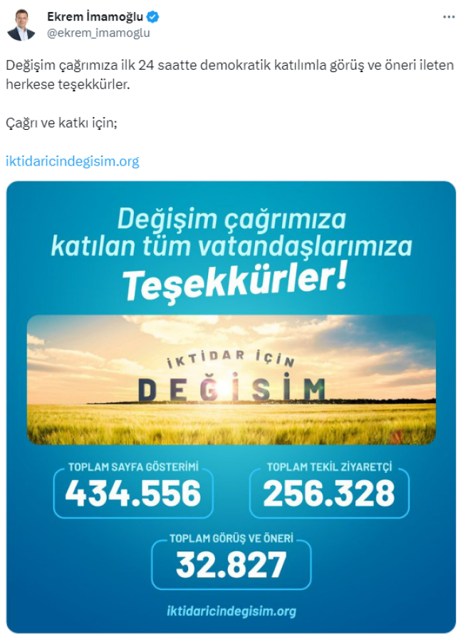 "Değişim çağrımıza ilk 24 saatte demokratik katılımla görüş ve öneri ileten herkese teşekkürler. Çağrı ve katkı için; https://iktidaricindegisim.org