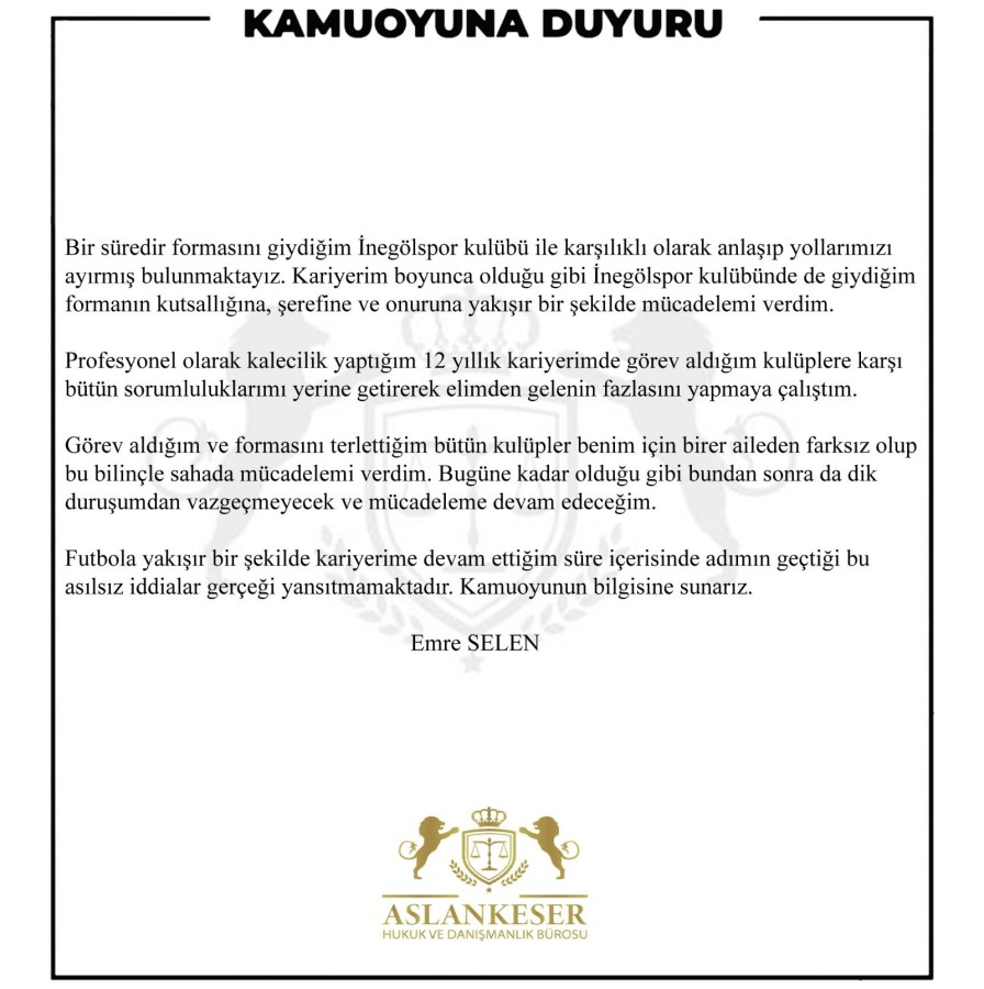 Diğer kaleci Emre Selen ise bir süredir formasını giydiği İnegölspor ile karşılıklı görüşüp yollarını ayırdığını belirterek, "Profesyonel olarak kalecilik yaptığım 12 yıllık kariyerimde formasını giydiğim bütün takımlar benim için birer aileden farksız olup bu bilinçle sahada mücadelemi verdim. Futbola yakışır bir şekilde kariyerime devam ettiğim bu süre içerisinde adımın geçtiği bu asılsız iddialar gerçeği yansıtmamaktadır" şeklinde konuştu.