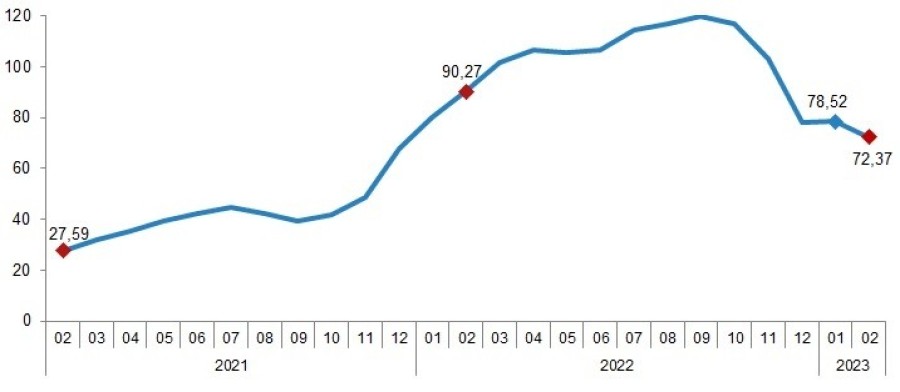 İnşaat maliyet endeksi, şubat ayında aylık bazda yüzde 2,08, yıllık bazda ise yüzde 72,37 yükseldi.