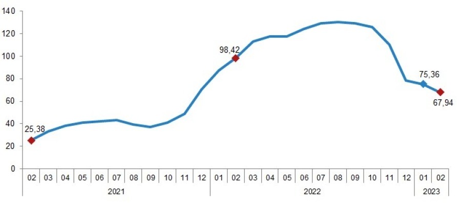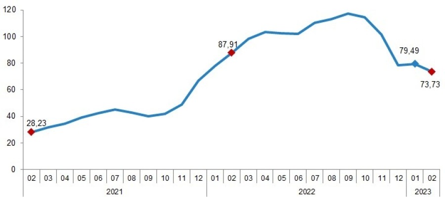 TÜİK, şubat ayı inşaat maliyet endeksi verilerini yayımladı. Verilere göre inşaat maliyet endeksi, şubat ayında bir önceki aya göre yüzde 2,08, bir önceki yılın aynı ayına göre yüzde 72,37 yükseldi. Bir önceki aya göre malzeme endeksi yüzde 3,43 arttı, işçilik endeksi yüzde 1,20 azaldı. Ayrıca bir önceki yılın aynı ayına göre malzeme endeksi yüzde 62,52, işçilik endeksi yüzde 103,99 arttı.