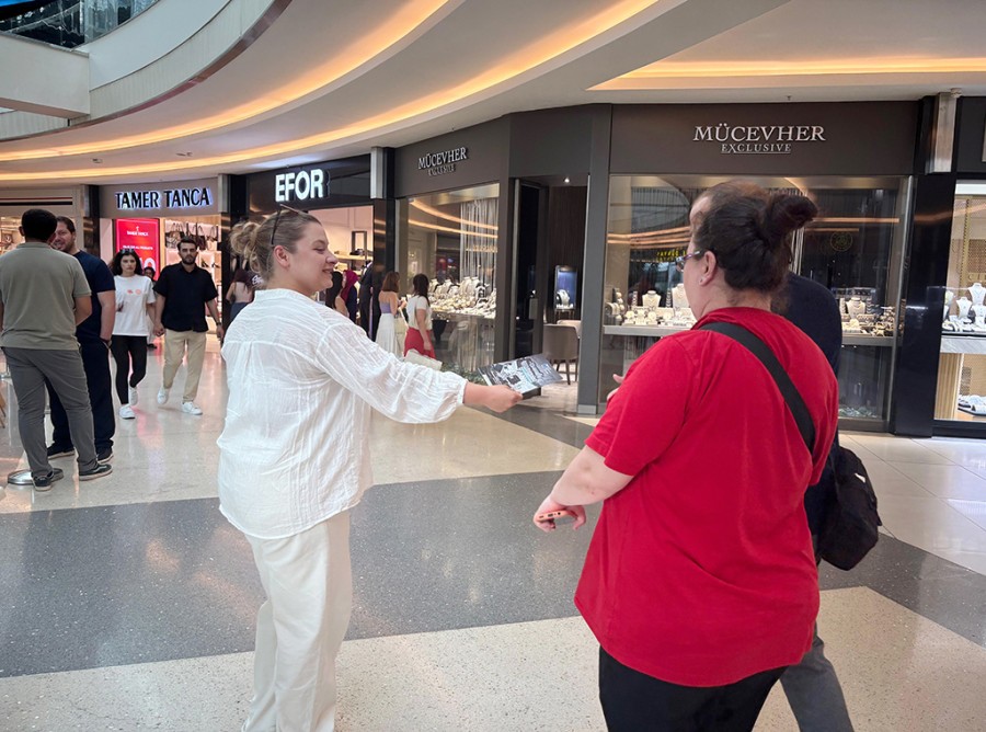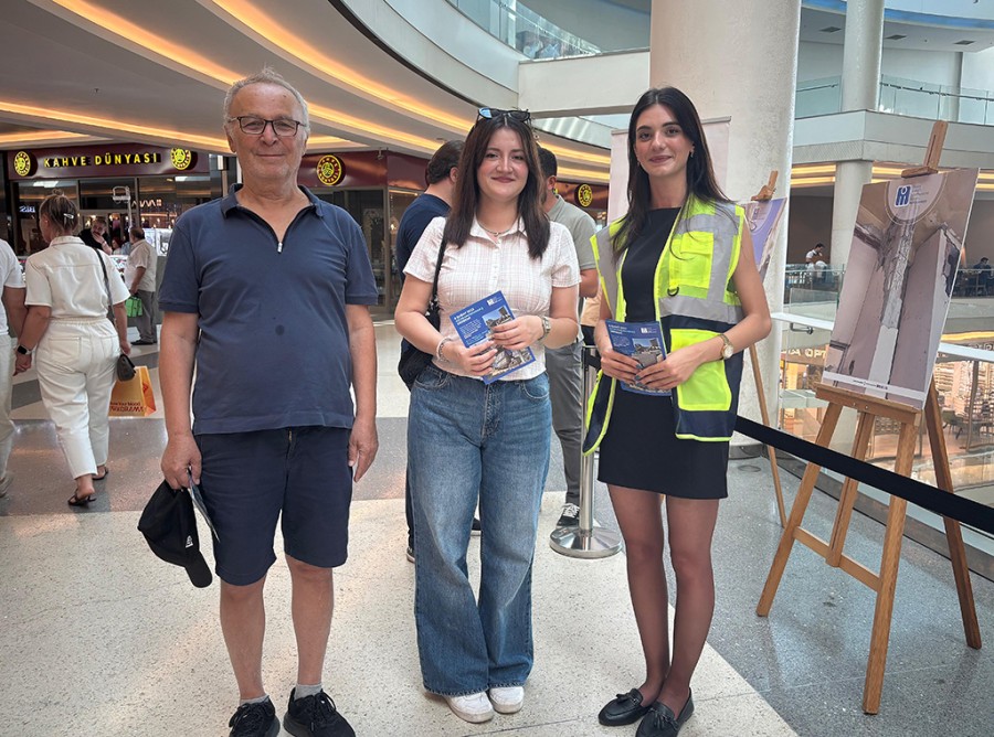 Deprem gerçeğini hatırlatan fotoğrafların sergilendiği etkinlikte genç inşaat mühendisleri halkı bilinçlendirmek için broşür dağıttı.