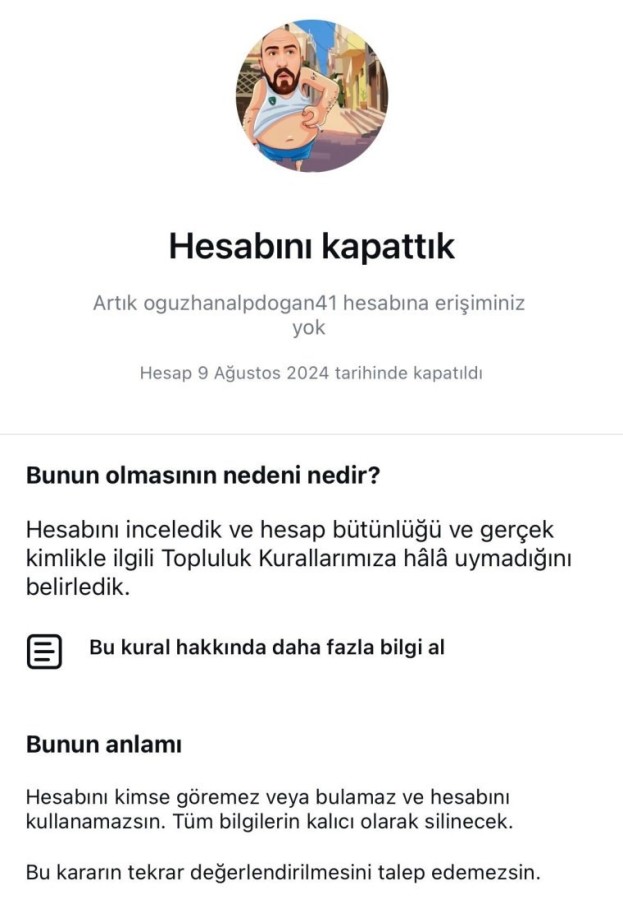 Türkiye'de 8 gün süren instagram erişim yasağı kaldırıldı. Erişim engelinin kaldırılmasının ardından sosyal medya fenomeni Oğuzhan Alpdoğan büyük bir şok yaşadı. X hesabından paylaşım yapan Alpdoğan hesabının kapatıldığını açıkladı.