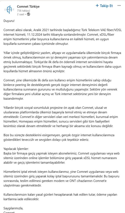 Comnet, mevcut abonelerini geçiş ve iptal işlemlerine ilişkin olarak, diğer internet sağlayıcılarına geçmek isteyen kullanıcıların, Comnet'in mobil uygulaması veya web sitesi üzerinden xDSL hizmet numaralarını alarak işlemlerini tamamlayabileceğini açıkladı.