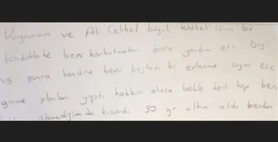Araçta bulunan intihar mektubunda çok korktuğunu dile getiren kadın, "Beni bu duruma düşüren Ali Çelikel büyük tehlikeli. Beni kendine bağladı, aynı eve girme planları yaptı. Sonra oyalamaya başladı. Tehditler edip, geceleri beni korkutarak paramı aldı. Konya'ya yanına gittim, silah çıkardı. Zor çıktım, beni öldürecekti. Hep bir oyun içindeymişim. Bana ne kötülük varsa yapacağını söyledi. Artık yaşamak istemiyorum. Hep uğraşacak. Ben artık dayanamıyorum" yazdı.