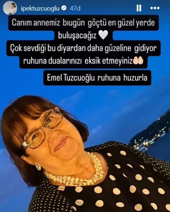 İpek Tuzcuoğlu'nun annesi Emel Tuzcuoğlu hayatını kaybetti. Tuzcuoğlu, acı haberi Instagram hesabından paylaştı.