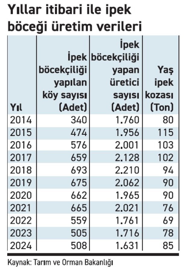2014 yılında 340 olan ipekböcekçiliği yapılan köy sayısı, 2024 itibarıyla 508'e yükselse de 2018'de görülen 693 seviyesinden sonra sürekli bir azalma trendine girdi. Üretici sayısı ise 2018'de 2 bin 210 kişiyle zirveye çıkarken, 2024'te 1 bin 631'e gerileyerek yüzde 26 düşüş yaşadı. Benzer şekilde, 2020 yılından itibaren ipek kozası üretiminde de düşüş gözlendi. 2015'te 114,7 ton yaş koza üretilirken, 2024'te bu rakam 84,8 tona geriledi. Sektörde yaşanan bu gerilemenin, artan üretim maliyetleri, genç nüfusun tarımdan uzaklaşması ve destekleme politikalarındaki değişimler nedeniyle olduğu belirtiliyor. Uzmanlar, ipekböcekçiliğinin sürdürülebilirliğini sağlamak için teşvik mekanizmalarının güçlendirilmesi gerektiğini vurguluyor.