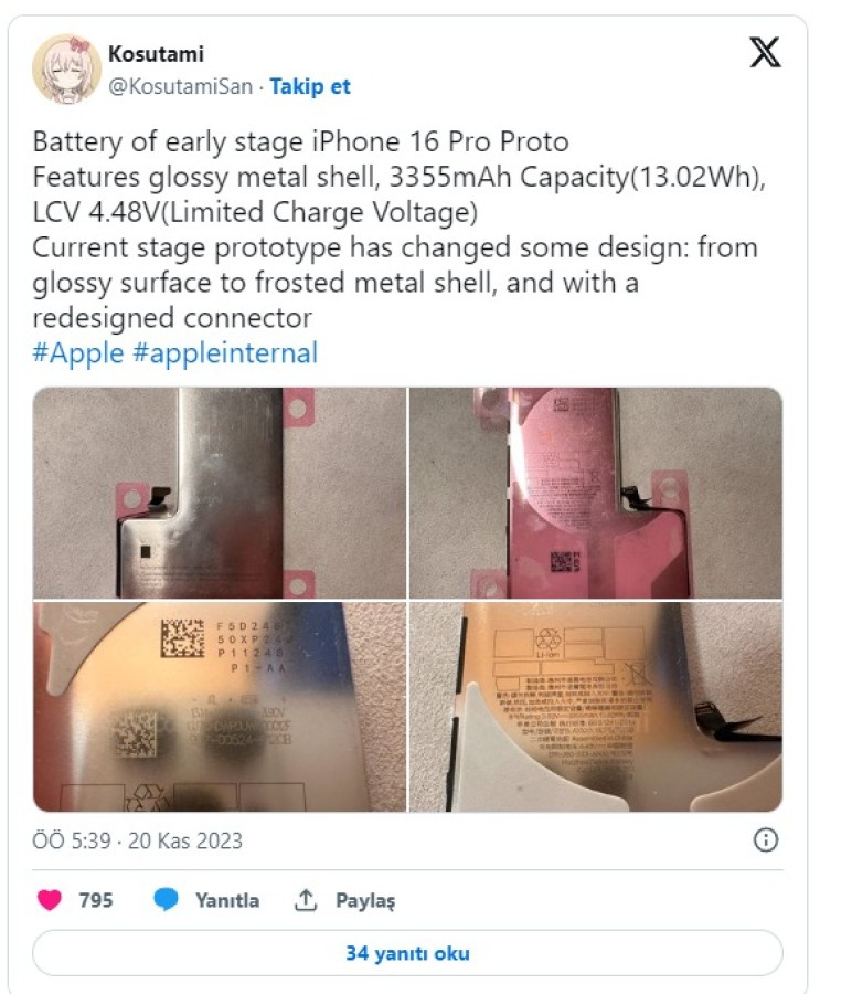 Chip dergisinin aktardığına göre, MacRumors aracılığıyla @KosutamiSan tarafından sızdırılan görüntülerde, iPhone 16 Pro'nun pil kapasitesinin 3.355mAh olduğu görülüyor. Referans olarak iPhone 15 Pro'nun 3.274mAh'lik bataryası ele alındığında iyi bir gelişme olsa da bu kapasitenin hala modern bir akıllı telefon için daha iyi olabileceği belirtiliyor.