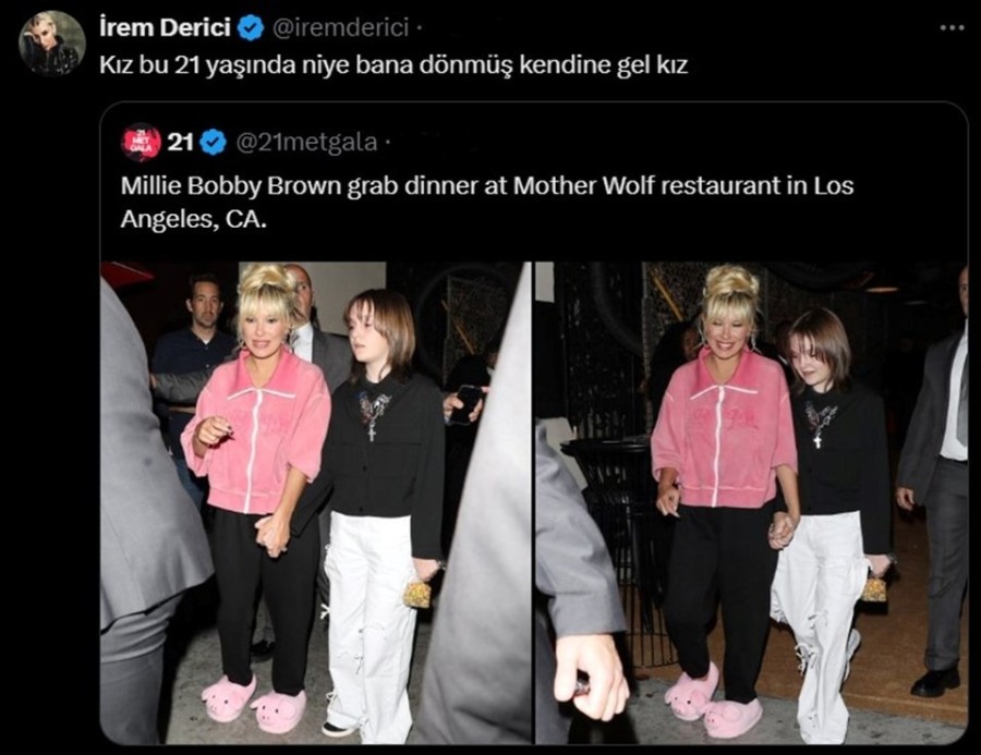 37 yaşındaki İrem Derici, Millie Bobby Brown için "Kız bu 21 yaşında niye bana dönmüş kendine gel kız" ifadelerini kullandı.