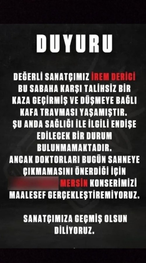 Ünlü şarkıcı İrem Derici, Mersin konseri öncesi geçirdiği talihsiz kazayla sevenlerini üzdü. Hastaneye kaldırılan Derici'nin sağlık durumu iyi, ancak düşmeye bağlı kafa travması nedeniyle konserini iptal etmek zorunda kaldı.