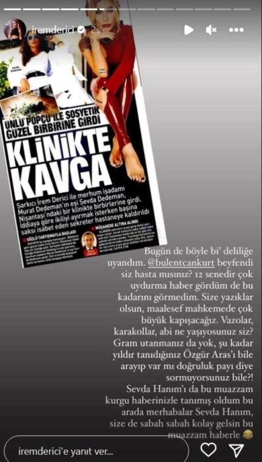 Instagram hesabından haberi yapan gazeteciye tepki gösteren İrem Derici, "Bugün de böyle bir deliliğe uyandım. Beyefendi siz hasta mısınız? 12 senedir çok uydurma haber gördüm de bu kadarını görmedim. Size yazıklar olsun, maalesef mahkemede çok büyük kapışacağız. Vazolar, karakollar abi ne yaşıyorsunuz siz? Gram utanmanız da yok, şu kadar yıldır tanıdığınız Özgür Aras'ı (basın danışmanı) bile arayıp var mı doğruluk payı diye sormuyorsunuz bile. Sevda Hanım'ı da bu muazzam kurgu haberinizle tanımış oldum bu arada merhabalar Sevda Hanım. Size de sabah sabah kolay gelsin bu muazzam haberle" ifadelerini kullandı.