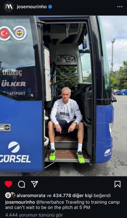 Jose Mourinho'nun Fenerbahçe'deki ilk idman günü öncesi takım otobüsünden yaptığı 'Sahada olmak için sabırsızlanıyorum' paylaşımı, çok sayıda beğeni alırken, eski öğrencisi Alvaro Morata da paylaşımı beğenen isimler arasında yer aldı.