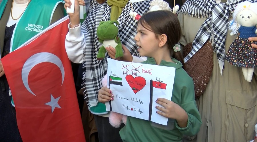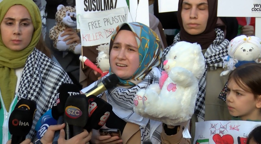 Grup adına basın açıklamasını okuyan Yeryüzü Çocukları Derneği Başkanı Sümeyye Altun, "Bugün buraya çocuklar için çalışan STK'lar olarak, İşgalci İsrail'in Gazze'de katlettiği ve katletmeye devam ettiği çocukların sesi olmak için toplandık. Ve tüm dünyaya şunu haykırıyoruz: bu oyuncaklar İsrail'in katlettiği her bir çocukla beraber kana bulanıyor. Bizler artık çocukların kanlı parçalanmış bedenlerini değil, güven içinde evlerinde oyuncaklarıyla oynarken görmek istiyoruz. Bunun için herkesi İsrail'in işlediği bu soykırımı durdurmak ve yaptırımların uygulanması için harekete geçmeye davet ediyoruz" dedi.