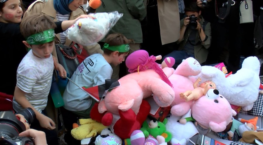 İsrail'in Gazze'deki saldırıları Yeryüzü Çocukları Derneği tarafından protesto edildi. İsrail Başkonsolosluğu önünde toplanan eylemciler, çocuk ölümlerine dikkat çekmek için konsolosluk önüne oyuncak bıraktı.