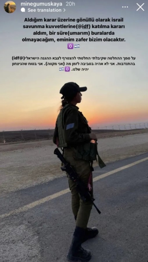 İsrail Savunma Kuvvetleri üniforması ve üstündeki silahlarla poz veren Mine Gümüşkaya, "Aldığım karar üzerine gönüllü olarak İsrail Savunma Kuvvetleri'ne katılma kararı aldım, bir süre buralarda olmayacağım, eminim zafer bizim olacaktır" notuyla paylaştı.