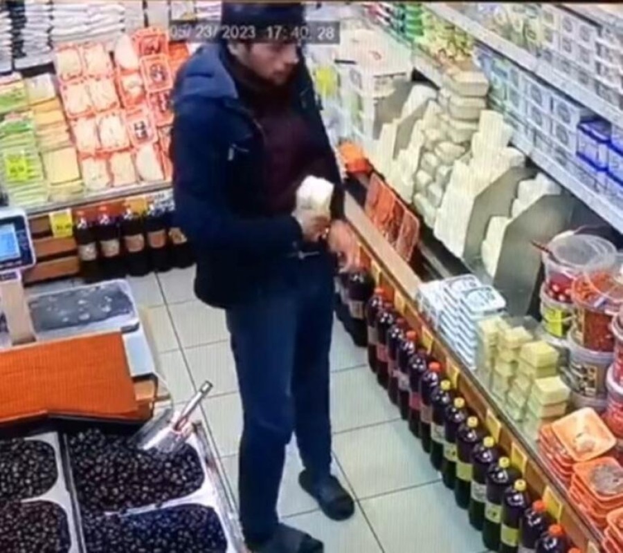 Yine Esentepe Mahallesi'nde bir markete alışveriş yapma bahanesiyle gelen kişi, şarküteri bölümünde dört paket kaşarı alıp, elbisesinin içine sakladıktan sonra marketten kaçtı. O anlar da marketin güvenlik kamerasıyla kaydedildi.