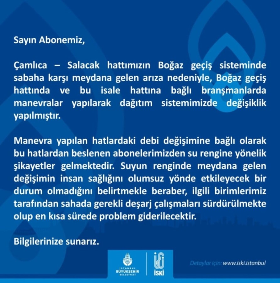 Manevra yapılan hatlardaki debi değişimine bağlı olarak su rengine yönelik şikayetler geldiği belirtilen açıklamada, "Suyun renginde meydana gelen değişimin insan sağlığını olumsuz yönde etkileyecek bir durum olmadığını belirtmekle beraber, ilgili birimlerimiz tarafından sahada gerekli deşarj çalışmaları sürdürülmekte olup en kısa sürede problem giderilecektir." denildi.