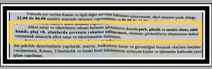 İstanbul Valisi Davut Gül'ün 17 Ağustos 2023'te yayımladığı, "Alkol Satışı ve Alkollü İçeceklerin Tüketimi" başlıklı genelgesinde, kolluk güçlerine, "alkol satışı ve tüketilmesi ruhsatı bulunan işletmeler dışında halka açık deniz ve sahil kenarlarında, plaj, park, piknik ve mesire alanlarında alkollü içki satışı ve tüketilmesinin önlenmesi" talimatı verildi.