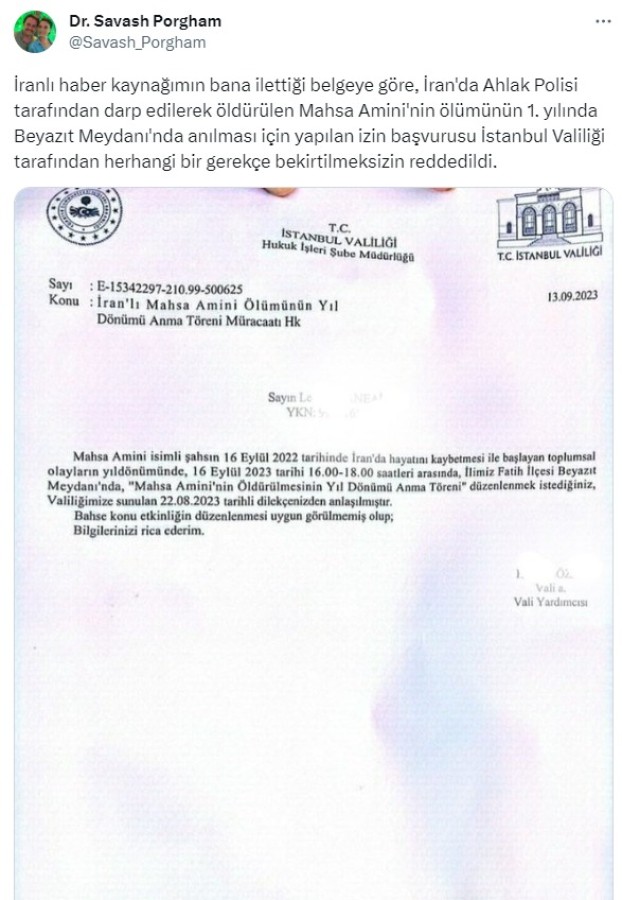 Türkiye'deki sivil toplum kuruluşları, Amini'nin öldürülmesinin yıldönümünde Beyazıt meydanında anma töreni gerçekleştirmek için İstanbul Valiliği'ne başvuru yaptı.