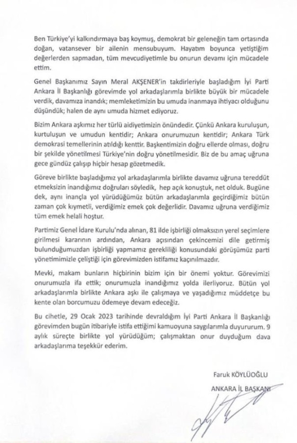 "Partimiz Genel İdare Kurulunda alınan, 81 ilde iş birliği olmaksızın yerel seçimlere girilmesi kararının ardından, Ankara açısından çekincemizi dile getirmiş bulunduğumuzdan işbirliği yapmamız gerekliliği konusundaki görüşümüz parti yönetimimizle çeliştiği için görevimizden istifamız kaçınılmazdır. 29 Ocak 2023'te devraldığım İYİ Parti Ankara İl Başkanlığı görevimden bugün itibarıyla istifa ettiğimi kamuoyuna saygılarımla duyururum."