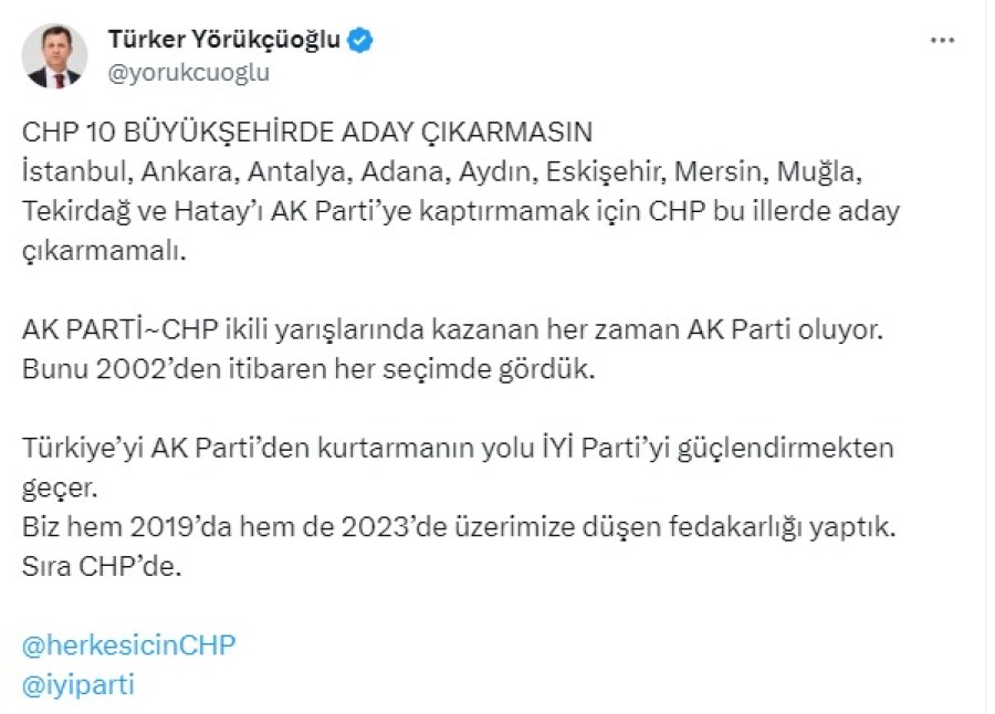 İYİ Parti Genel Başkan Yardımcısı Türker Yörükçüoğlu, yerel seçimler için CHP'ye '10 büyükşehirde aday çıkarmama' teklifinde bulunarak, "Biz üzerimize düşen fedakârlığı yaptık. Sıra CHP'de" ifadelerini kullandı.