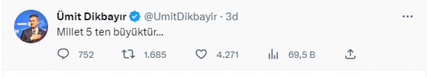 Önce İYİ Parti Sakarya Milletvekili Ümit Dikbayır, sosyal medya hesabından yaptığı paylaşımda, ''Millet 5'ten büyüktür'' ifadelerini kullandı. Dikbayır dakikalar sonra bu paylaşımını sildi.
