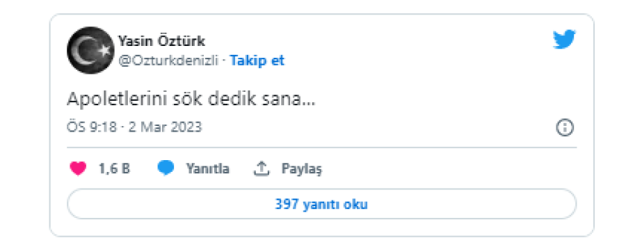 Sonrasında İYİ Parti Kurucular Kurulu üyesi Yasin Öztürk de sosyal medya hesabından dikkat çekici bir paylaşımda bulundu. Öztürk yaptığı paylaşımda, ''Apoletlerini sök dedik sana'' ifadelerini kullandı.