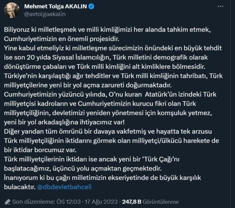 Akalın, Devlet Bahçeli'yi etiketlediği paylaşımını şöyle sürdürdü: