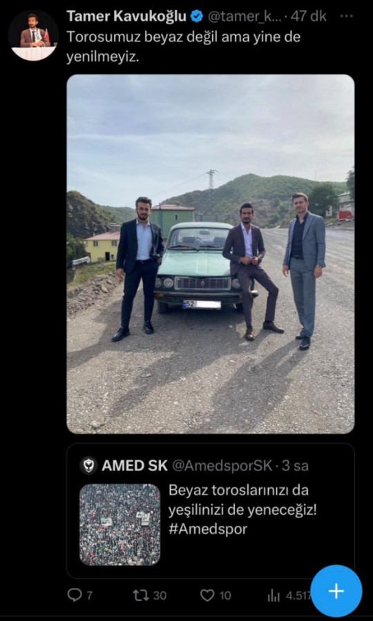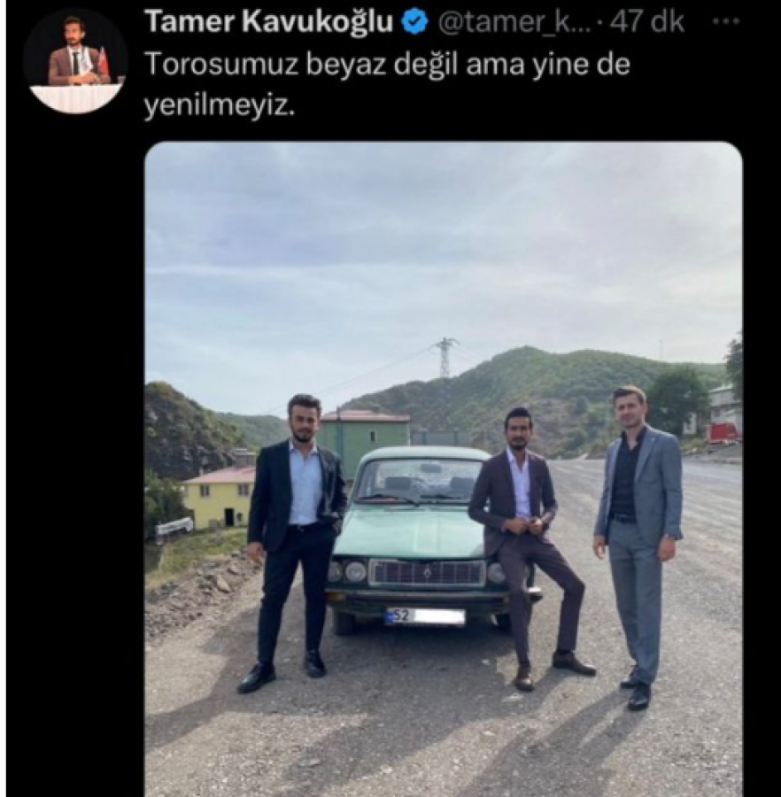 İYİ Parti İstanbul Gençlik Kolları İl Teşkilat Başkanı Tamer Kavukoğlu, Bursapor tribünlerindeki 'beyaz toros' pankartlarına tepki gösteren Amedspor'a yeşil bir Renault toros önünde çektirdiği fotoğrafla yanıt verdi: "Torosumuz beyaz değil ama yine de yenilmeyiz."