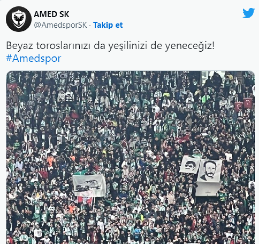 Bugün TFF 2'nci Lig'deki Bursaspor-Amedspor maçında konuk takım Amedspor'un futbolcuları ve teknik ekibi saldırıya uğramış, Bursaspor tribünlerinde 1990'lı yıllardaki faili meçhul cinayetlerin sembolü 'Beyaz Toros' ve 'Yeşil' posterleri açılmıştı.