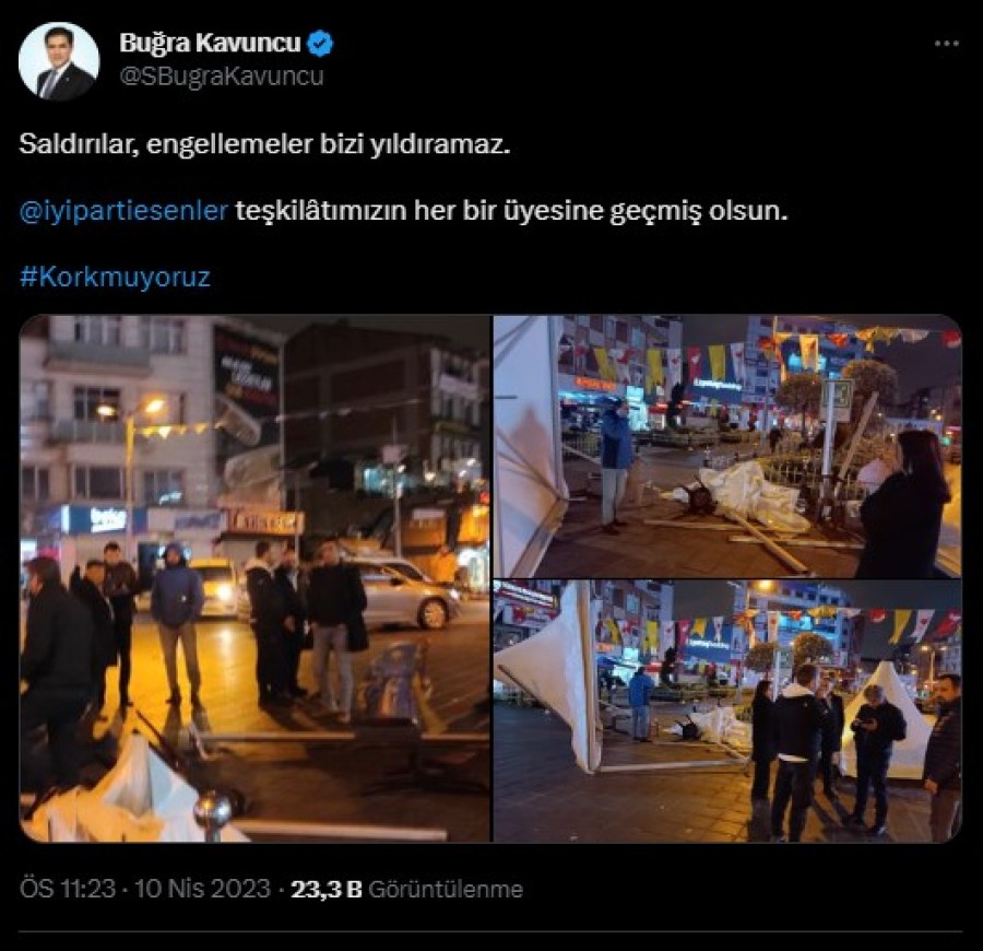 İYİ Parti Esenler İlçe Başkanlığı'nın seçim standına bir grup tarafından saldırı düzenlendi. Yaşananların ardından açıklama yapan İYİ Parti Seçim Kampanyasından Sorumlu Genel Başkan Yardımcısı Buğra Kavuncu, sosyal medya hesabından şu paylaşımı yaptı: