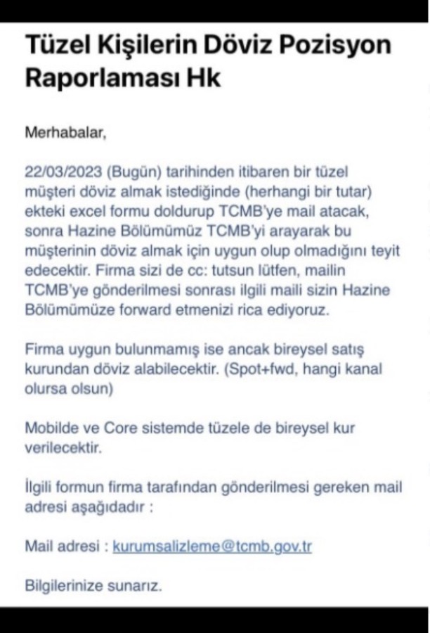Döviz alacak tüzel kişilerin Türkiye Cumhuriyeti Merkez Bankası'na (TCMB) mail atmasının istendiği görüntüde, çok sayıda talimat yer aldı. Ekran görüntüsünü paylaşan Yılmaz, "Siyasi iktidarın kontrolündeki Merkez Bankası'nın açıkladığı son düzenleme adım adım tam teşekküllü sermaye kontrolüne gittiğimizin son kanıtıdır" diye yazdı. Yılmaz, paylaşımına şunları ekledi: