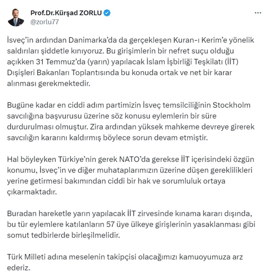 Kürşad Zorlu, İsveç ve Danimarka'daki Kur'an yakma eylemleri ile yarın yapılacak İİT Dışişleri Bakanları Toplantısı'na ilişkin açıklamalar yaptı. Zorlu, sosyal medya hesabından yaptığı açıklamada şu ifadeleri kullandı: