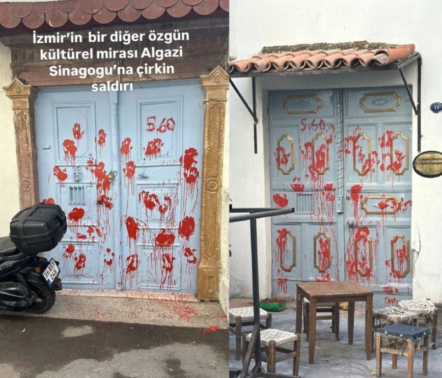Konak ilçesindeki Kemaraltı'nda yer alan Sinyora ve Algazi sinagoglarına kan kırmızısı boyadan oluşan el izleri sürüldüğü görüldü.