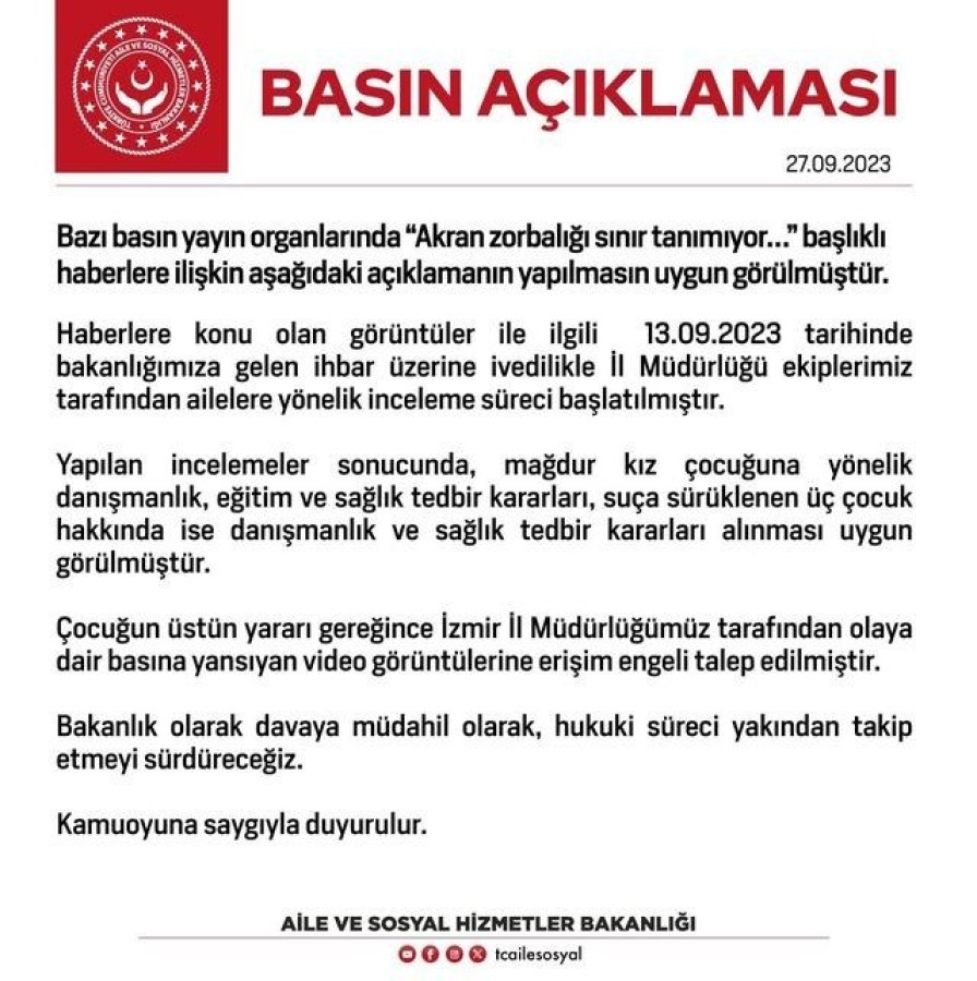 Bakanlık tarafından yapılan açıklamada "13.09.2023 tarihinde gelen ihbarla inceleme başlatılmıştır. İncelemeler sonucunda mağdur kız çocuğuna yönelik danışmanlık, eğitim ve sağlık tedbir kararları, suça sürüklenen üç çocuk hakkında ise danışmanlık ve sağlık tedbir kararları alınması uygun görünmüştür" denildi.