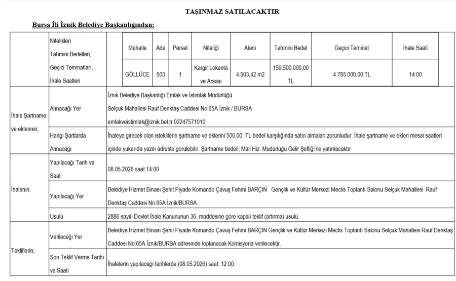 Bursa İli İznik Belediye Başkanlığı tarafından Resmi Gazete'de yayımlanan ilana göre, mülkiyeti belediyeye ait bir taşınmaz satışa sunuluyor. Göllüce Mahallesi'nde bulunan, "kargir lokanta ve arsası" niteliğindeki taşınmazın yüzölçümü 4.503,42 metrekare olarak açıklandı.