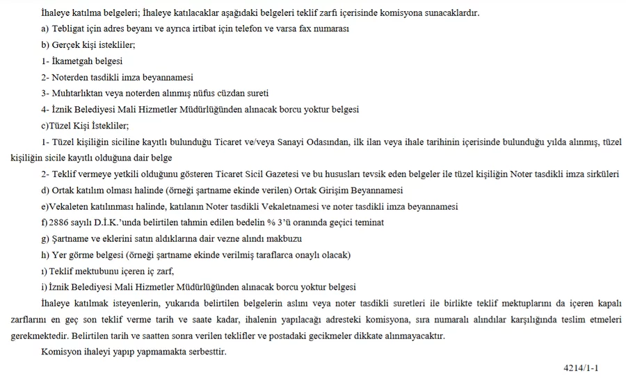 Belediye tarafından yapılan duyuruda, ihaleye ilişkin tüm detayların şartnamede yer aldığı belirtilirken, sürece katılmak isteyenlerin belirtilen koşulları yerine getirmesi gerektiği vurgulandı.