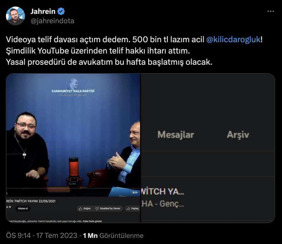 Jahrein seçim öncesi Kılıçdaroğlu'yla yaptığı yayını sosyal medya hesaplarından paylaşan CHP'ye telif davası açtığını duyurdu. Twitter'dan videoyu paylaşan Jahrein, "Videoya telif davası açtım dedem. 500 bin tl lazım acil @kilicdarogluk! Şimdilik YouTube üzerinden telif hakkı ihtarı attım. Yasal prosedürü de avukatım bu hafta başlatmış olacak" dedi.