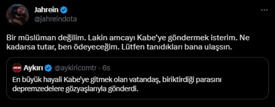 Jahrein, sosyal medya hesabından yaptığı paylaşımda Mehmet Çakırhan'ı Kabe'ye göndermek istediğini söyledi. Ücretini de kendisinin ödeyeceğini söyleyen Jahrein, paylaşımında şunları yazdı: