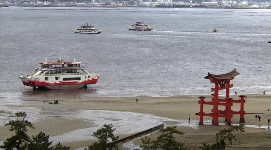 Japonya'nın Hiroşima eyaletinde UNESCO dünya mirası listesinde yer alan Itsukuşima tapınağının bulunduğu Miyajima sahili açıklarında seyreden bir feribot, yerel saatle 13.00 sıralarında karaya oturdu.