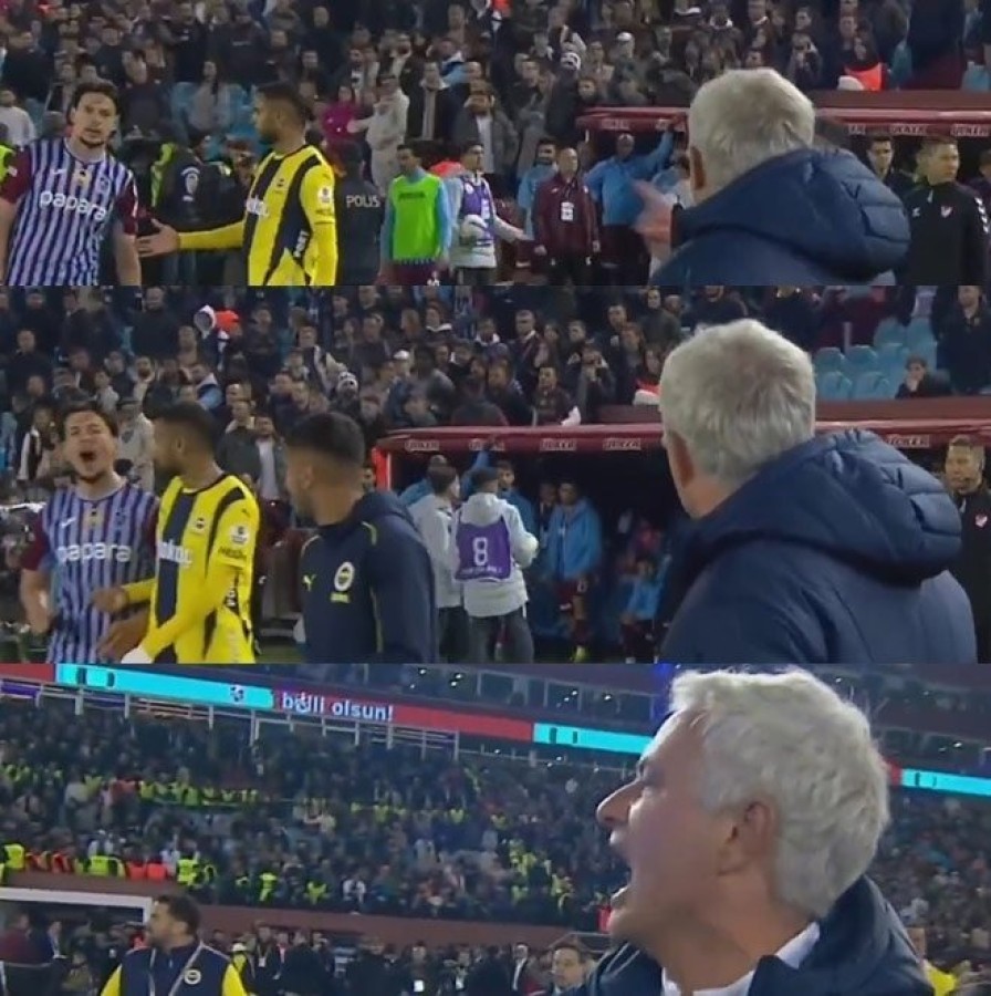 Sofyan Amrabat'ın 90+12'de gelen golüyle dev maçta 3 puanı alan sarı lacivertli ekibin Portekizli teknik direktörü Jose Mourinho, mücadele bitiminde saha içinde bordo mavili futbolcu Enis Destan'la sözlü tartışmaya girdi.